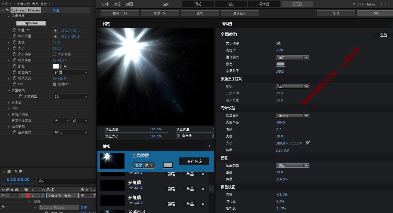 新版中文汉化Optical Flares v1.3.7镜头光晕耀斑AE特效插件教程 声明:本站所有文章,如无特殊说明或标注,均为本站原创发布。任何个人或组织,在未征得本站同意时,禁止复制、盗用、采集、发布本站内容到任何网站、书籍等各类媒体平台。如若本站内容侵犯了原著者的合法权益,可联系我们进行处理。